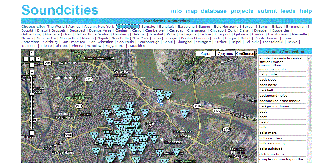 В завершение нашего не очень серьезного обзора, мы хотим представить вам сайт Soundcities, который посвящён накоплению базы звуков, которые привязаны к координатам к карты от Google. Как и все сайты в этом обзоре, это довольно простой любительский проект. Придирчивый пользователь может найти много недоработок, угловатостей, ошибок и неумелого проектирования. Выглядит он достаточно сыровато, можно сказать даже, как черновик. Заметно, что разработчик в большей степени сосредоточен на самой идее проекта, и не слишком много внимания уделяет дизайну страниц.
